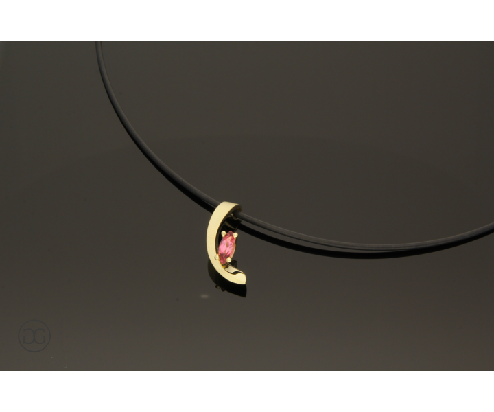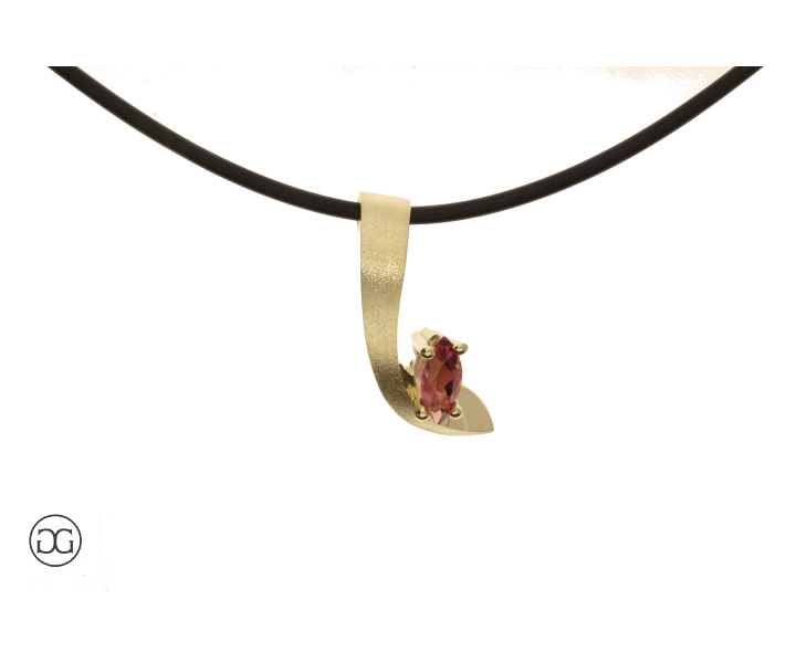 Feinstes Gelbgold besetzt mit einem wunderschönen, rosefarbenen Turmalin im Navetteschliff verleiht diesem Schmuckstück eine ganz besondere Note.