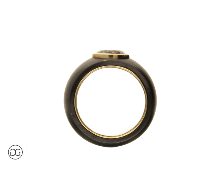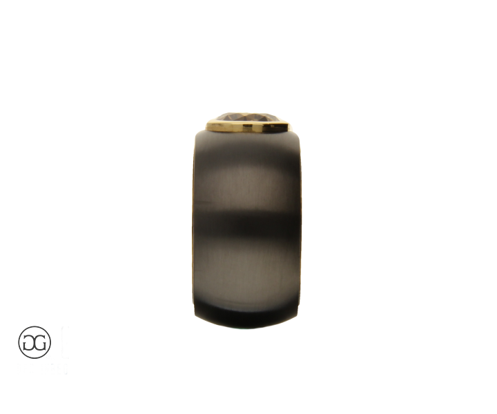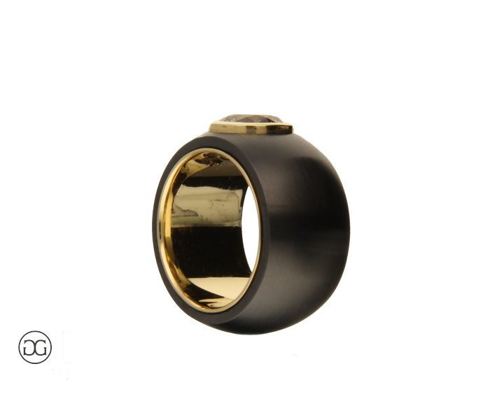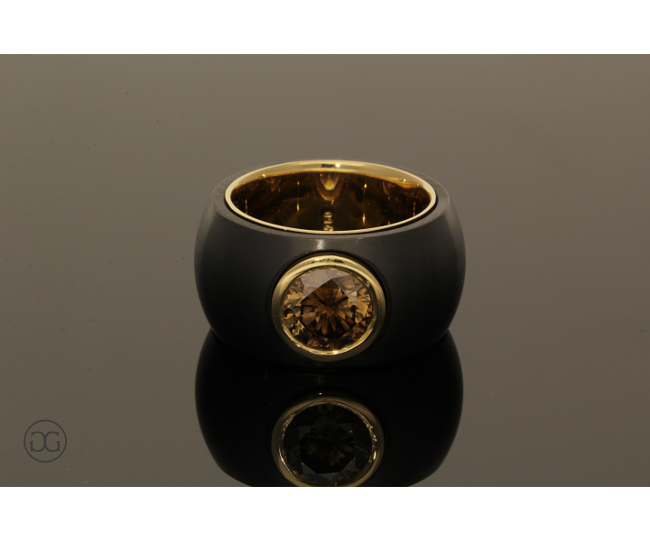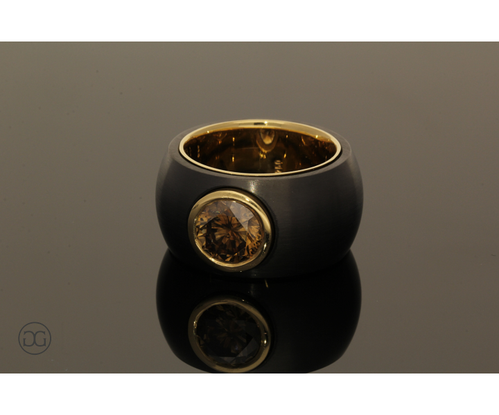 Feinstes Gelbgold in Hochglanzpolitur wird hierbei ganz bewusst in Kontrast mit geschwärztem Stahl gesetzt. Diese interessante Kombination dieser beiden so unterschiedlichen Materialien sowie die spielerischen Effekte zwischen polierten und mattierten Oberflächen verleihen diesem Ring einen Hauch von schlichter Eleganz und moderner Weiblichkeit. Der wunderschöne cognacfarbene Diamant im Brillantschliff rundet dabei diesen edlen Gesamteindruck farblich ab.