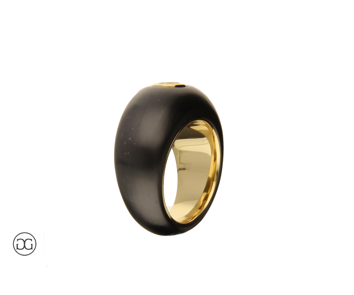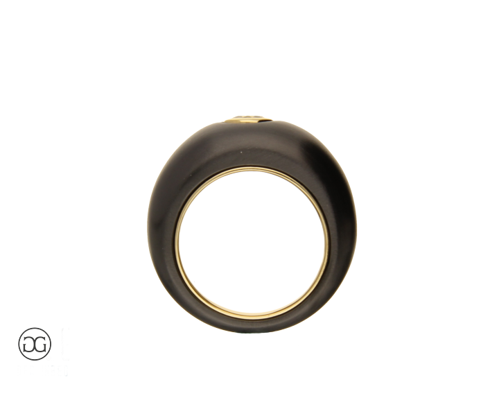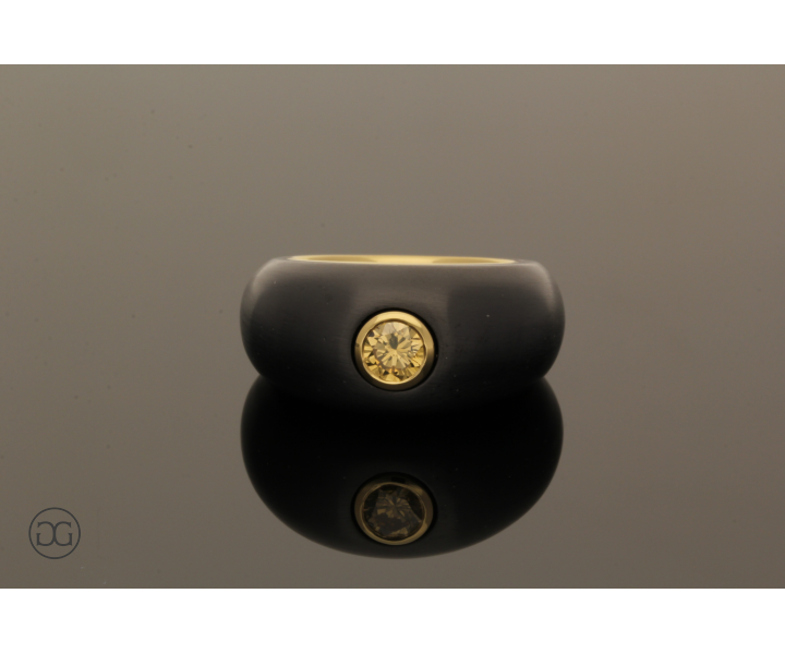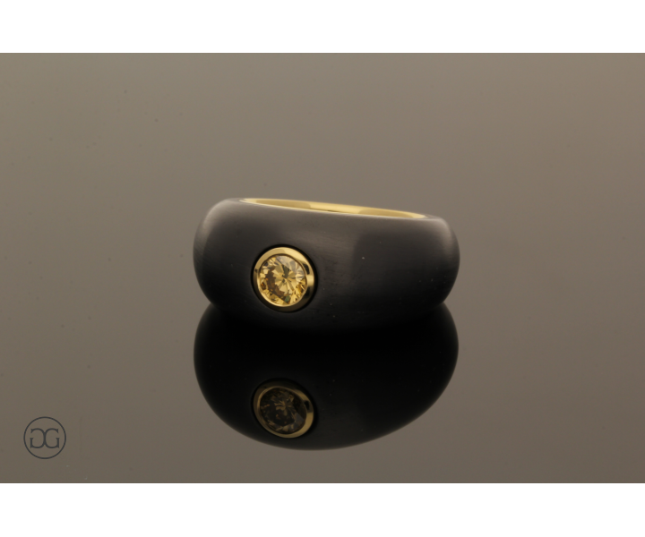 Feinstes Gelbgold in Hochglanzpolitur wird hierbei ganz bewusst in Kontrast mit geschwärztem Stahl gesetzt. Diese interessante Kombination dieser beiden so unterschiedlichen Materialien sowie die spielerischen Effekte zwischen polierten und mattierten Oberflächen verleihen diesem Ring einen Hauch von schlichter Eleganz und moderner Weiblichkeit. Der wunderschöne gelbliche Diamant im Brillantschliff rundet dabei diesen edlen Gesamteindruck farblich ab.