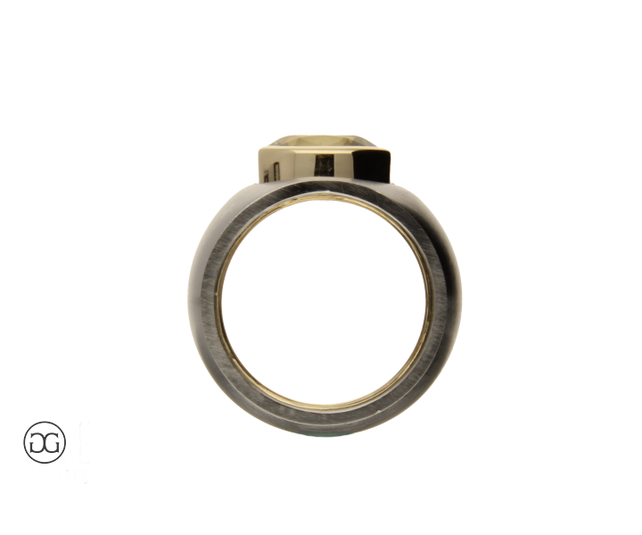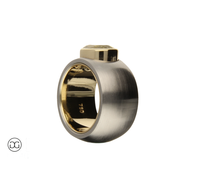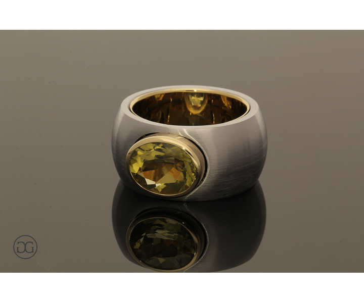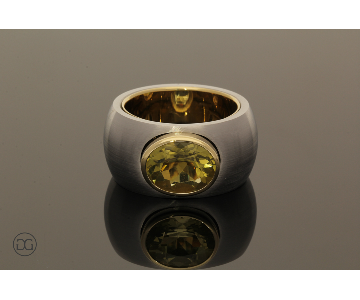 Feinstes Gelbgold in Hochglanzpolitur wird hierbei ganz bewusst in Kontrast mit mattiertem Stahl gesetzt. Diese interessante Kombination dieser beiden so unterschiedlichen Materialien sowie die spielerischen Effekte zwischen polierten und mattierten Oberflächen verleihen diesem Ring einen Hauch von schlichter Eleganz und moderner Weiblichkeit. Der wunderschöne grünlich gelbe Citrin im facettierten Ovalschliff rundet dabei diesen edlen Gesamteindruck farblich ab.
