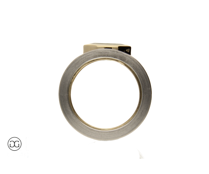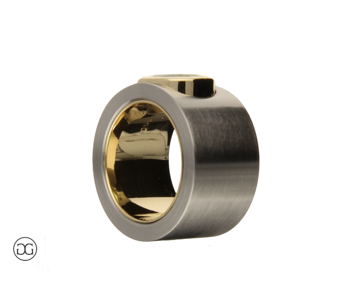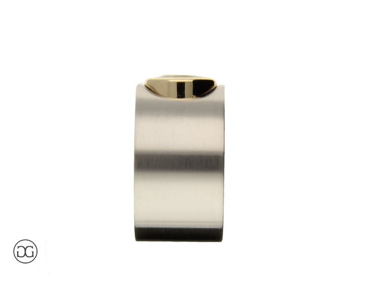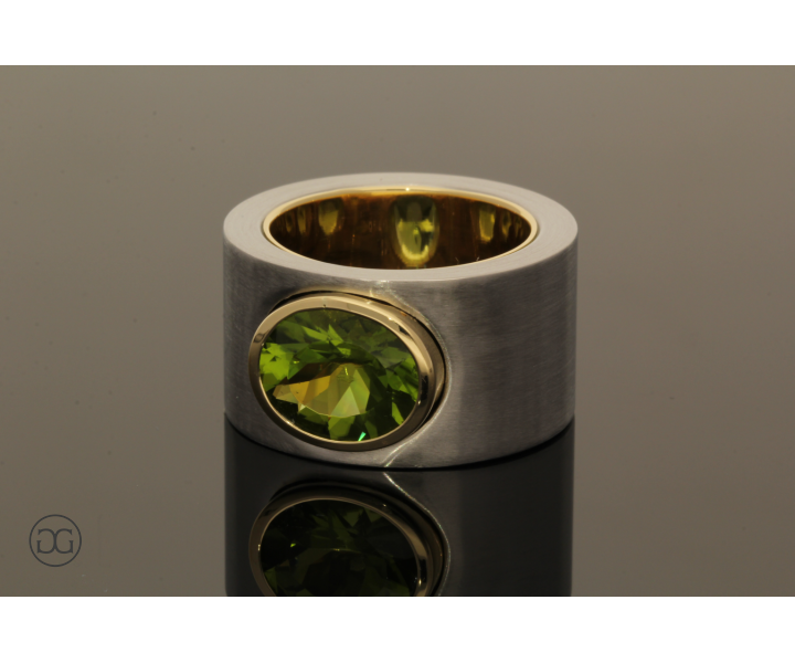 Feinstes Gelbgold in Hochglanzpolitur wird hierbei ganz bewusst in Kontrast mit mattiertem Stahl gesetzt. Diese interessante Kombination dieser beiden so unterschiedlichen Materialien sowie die spielerischen Effekte zwischen polierten und mattierten Oberflächen verleihen diesem Ring einen Hauch von schlichter Eleganz und moderner Weiblichkeit. Der wunderschöne grüne Peridot im facettierten Ovalschliff rundet dabei diesen edlen Gesamteindruck farblich ab.