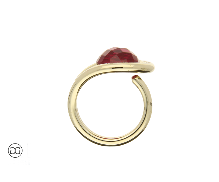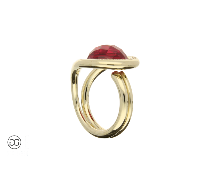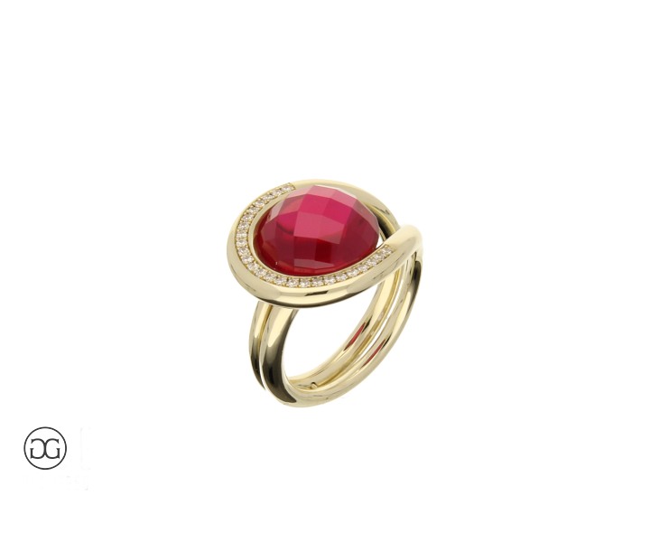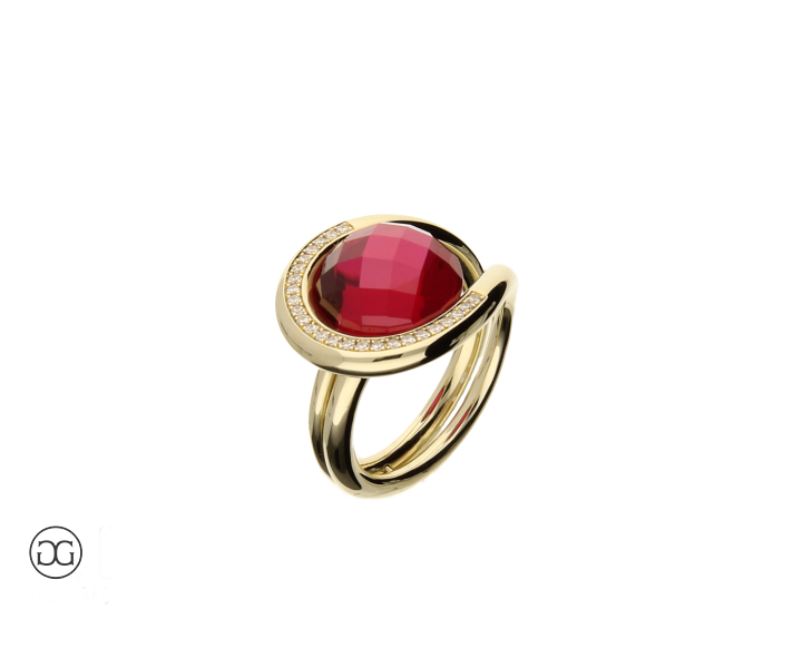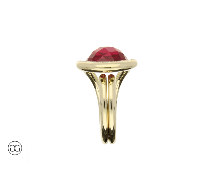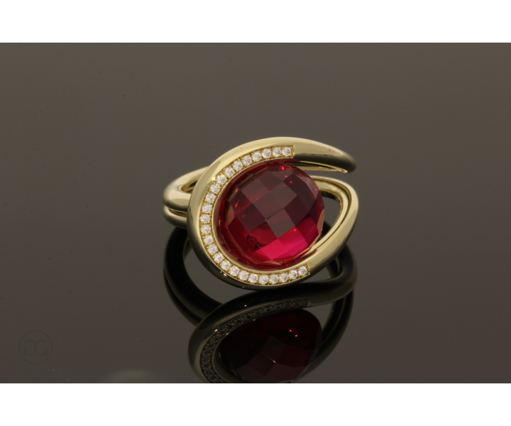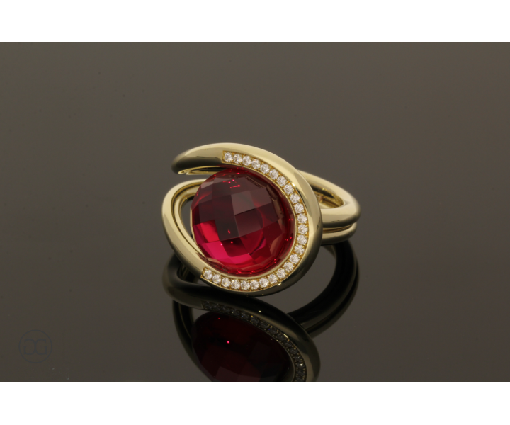 Edles Gelbgold in Hochglanzpolitur, ein wunderschöner facettierter synthetischer Rubin und hochwertige, funkelnde Brillanten verleihen diesem unverwechselbaren Schmuckstück einen Hauch von schlichter Eleganz und moderner Weiblichkeit.