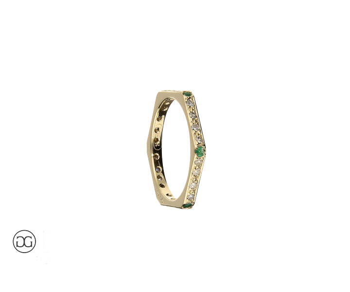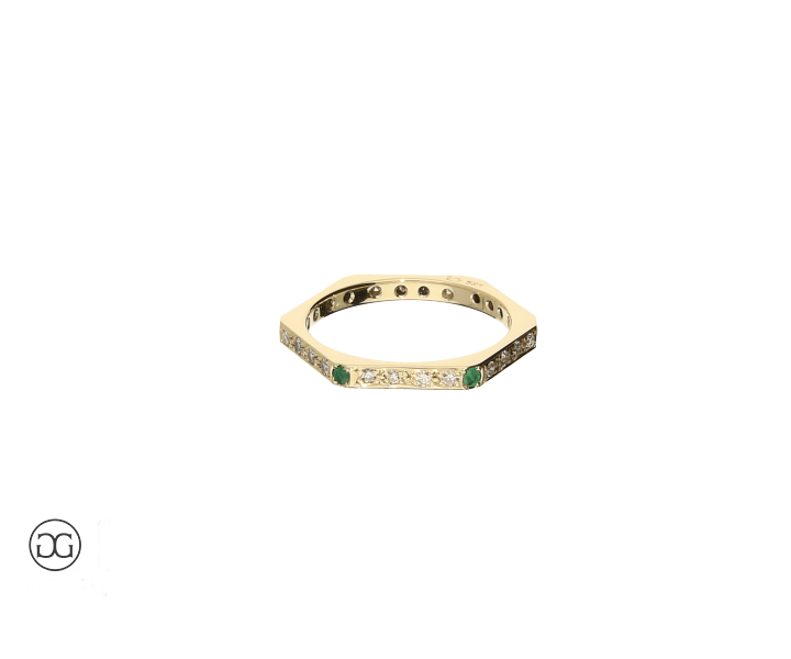 Feinstes Gelbgold in Hochglanzpolitur sowie zahlreich eingefasste Brillanten und Smaragde von hochwertiger Qualität verleihen diesem Ring eine ganz besondere Note.
