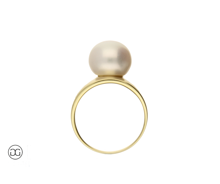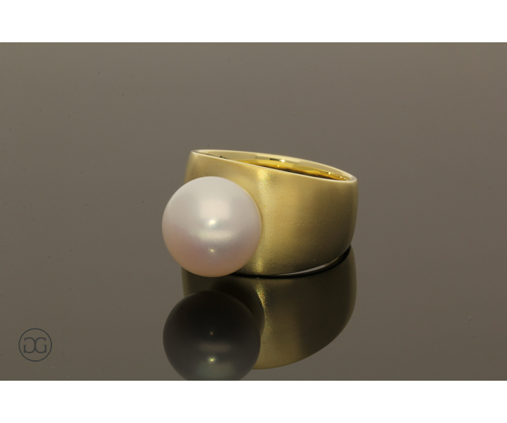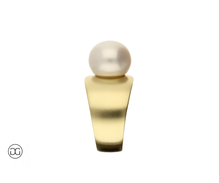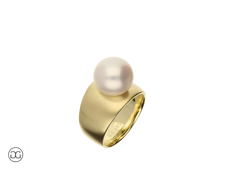 Die klare Formensprache, feinstes Gelbgold in seidenmatter Optik und eine wunderschöne naturfarbene Frischwasser-Zuchtperle verleihen diesem Ring einen Hauch von schlichter Eleganz und moderner Weiblichkeit.
