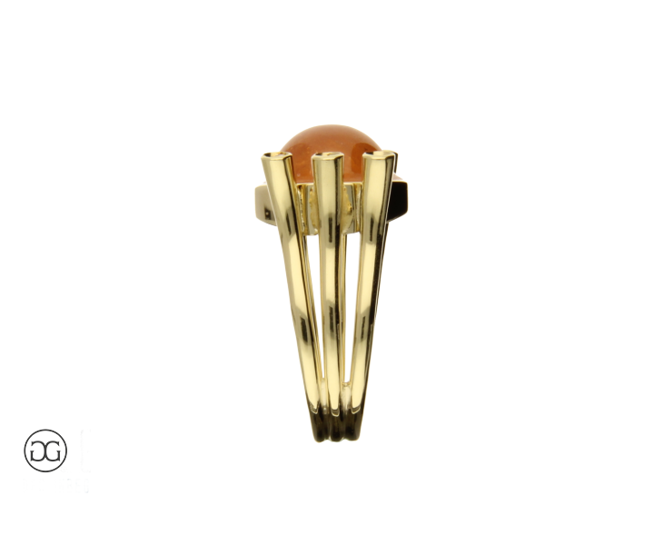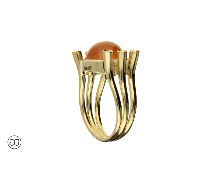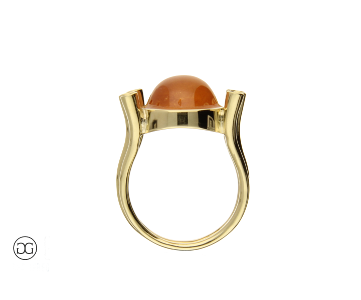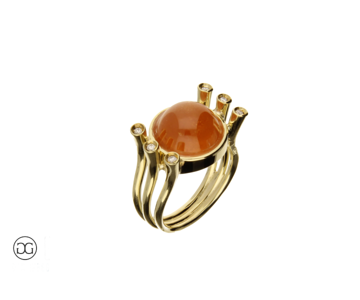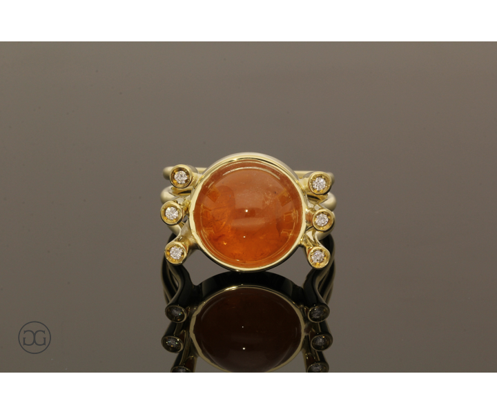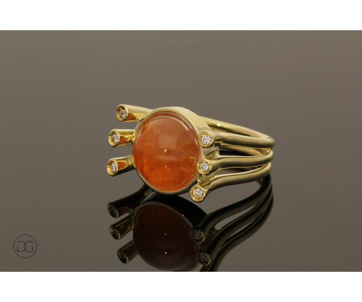 Feinstes Gelbgold in Hochglanzpolitur sowie ein wunderschöner Spessartin im Cabochonschliff umrahmt von kleinen funkelnden Brillanten verleihen diesem Ring eine ganz besondere Note.