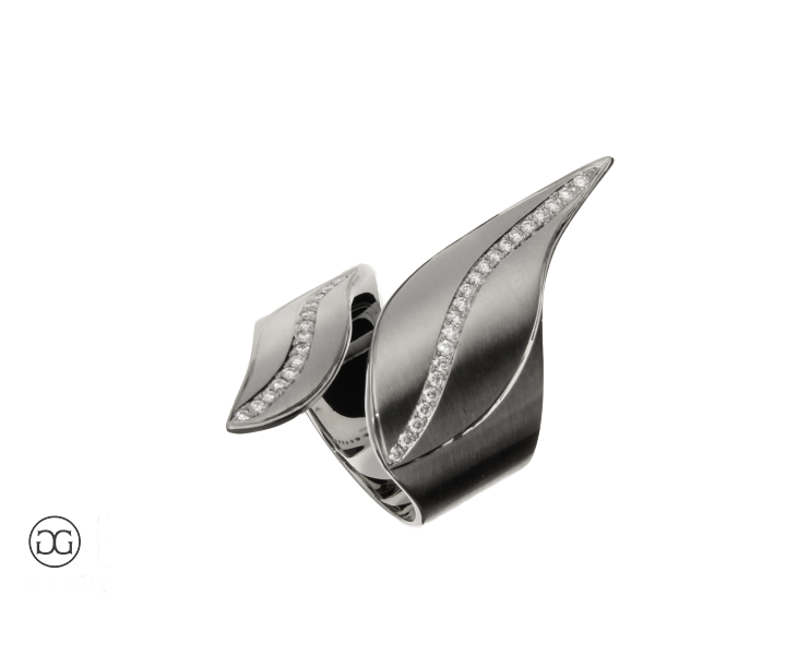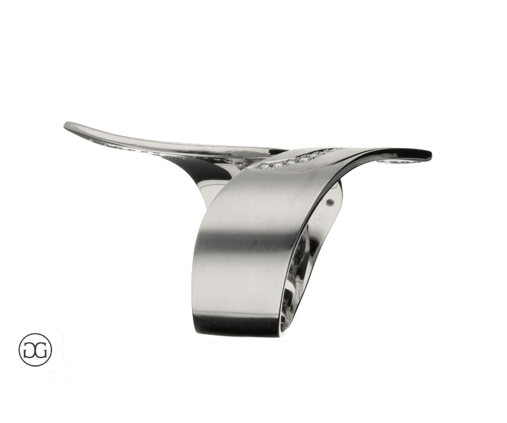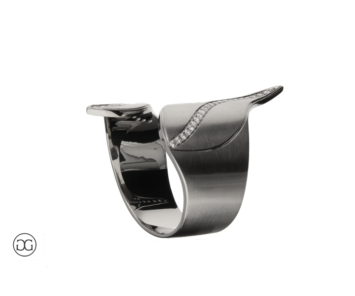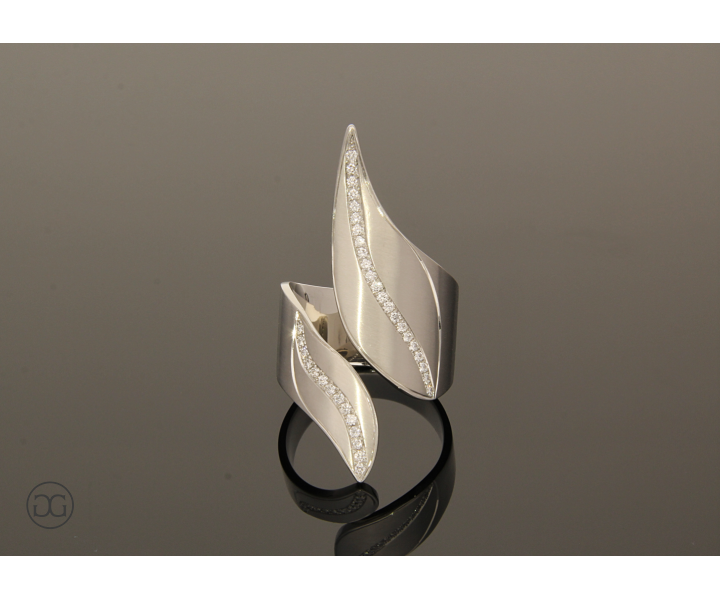 Dieser edle Diamantring besticht durch sein außergewöhnliches, modernes Design und seine schlichte, aber dennoch ausdrucksstarke Formensprache.