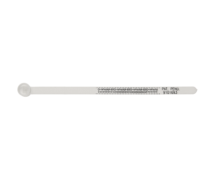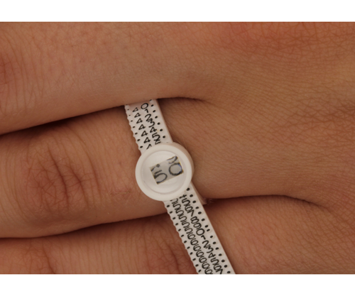 Das Ringmaß wird wie ein Gürtel gehandhabt. Sie stecken ein Ende in das kompakte Endstück und ziehen das Band um Ihren Finger zusammen, bis die passende Größe erreicht ist. Nun können Sie Ihre Ringgröße in der Lupe ablesen.